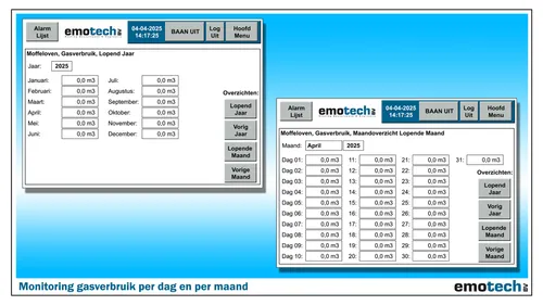 Tijdens bedrijf gebruikt een poedercoatinstallatie gas, waaronder de warmwaterketel van de voorbehandelingstunnel, de droger en natuurlijk de moffeloven. De gaskosten hiervan zie je pas achteraf terug in de afrekening van het gasbedrijf. Om het gasverbruik te monitoren en daarbij beter te kunnen controleren, monteren we een Quantometer in de gasleiding, in combinatie met een extern touch-panel, waarmee het gasverbruik elke dag van de maand nauwkeurig kan worden afgelezen. Tevens kan het gasverbruik van maand tot maand worden weergeven voor elk jaar en het voorgaande jaar.