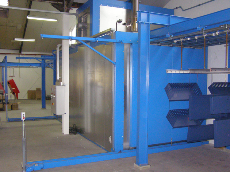 Kammeröfen werden meistens in Kombination mit manuell bedienter Förderung eingesetzt. Die Produkte werden manuell in den Ofen gefördert, wonach der Ofen mittels Schiebe- oder Schwenktür verschlossen wird. Die Aushärtung der Pulverschicht findet bei einer Temperatur von durchschnittlich 180-220°C statt. Nach Ablauf des Prozesses folgt eine Meldung im Schaltschrank, wonach die Produkte rausgenommen werden können, um abzukühlen und danach abgeholt zu werden.