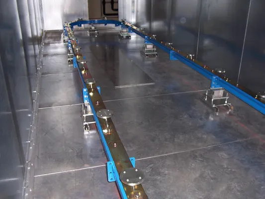 Bodenfördersysteme werden zunehmend verwendet und sind so ausgelegt, dass die Produkte auf der Förderbahn aufgestetz werden, statt daran aufgehängt. Dabei handelt es sich zum Beispiel um Felgen, Keramikgefäße oder Vasen, die aufgesetzt werden und danach von dem Bodenfördersystem durch die Kabine und den Ofen gefördert werden. Das Fördersystem kann, wenn erwünscht, mit Aufsetzspindeln geliefert werden, damit das Produkt in der Kabine mittels Wendestation gedreht werden kann. Auf diese Weise werden alle Ecken und Kanten des Produktes von den Düsen erreicht. Die Bodenfördersysteme von Kewesta werden inklusive Abschirmplatten geliefert, damit die Förderbahn völlig abgedichtet ist. Auf diese Weise können keine Verunreinigungen in die Kette gelangen, wodurch die Kette geschützt ist.