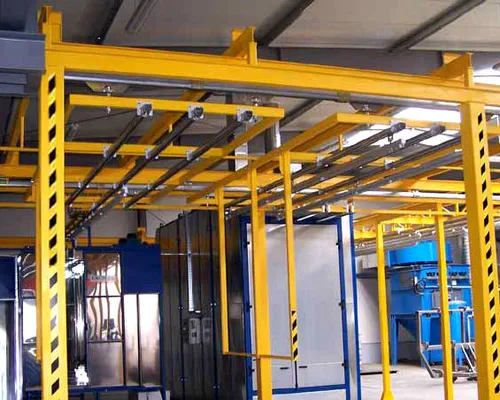 Das Monorailsystem ist ein nicht-angetriebenes System. Die Produkte werden mittels Räder manuell durch das Transportsystem bewegt. In einem Monorailsystem können unterschiedliche Komponenten eingebaut werden, damit eine flexibeles Routing des Produktes erreicht werden kann. Es können zum Beispiel Weichen in Y-Form oder in T-Form installiert werden, so wie Drehscheiben, und Hebe- und Absenkstationen für schwere Produkte. Auch sogenannte „fahrende Puffer“ bieten viel Flexibilität bei der manuelle Förderung durch die Möglichkeit, mehrere Produkte in Querlage gleichzeitig transportieren zu können. Auf diese Weise können die Produkte schnell an eine (feste) Schiene in Richtung Pulverkabine, Kammerofen oder Wartepuffer gekoppelt werden.