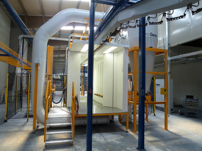 Pulverbeschichtungskabinen werden in der Regel inklusieve Filteranlage montiert, um den sogenannten Overspray sofort abzusaugen. Overspray ist der Anteil des verspritzten Pulvers, welches nicht auf das Produkt gelangt, sondern in Form von Sprühnebel in die Kabine entweicht. Der Zyklon holt im Schnitt 97% des Pulvers aus der Abluft, wonach dieses Pulver wiederverwendet werden kann. Dadurch ist der Zyklon ein sehr umweltfreundlicher und kostengünstiger Teil der Anlage.