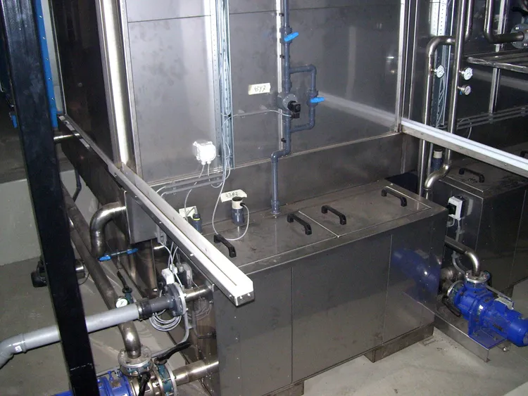 Wir liefern Kammervorbehandlungsanlagen aus rostfreiem Stahl. Während der Kammervorhbehandlung wird das Produkt in einem oder mehreren Kammern mit einer Reinigungsflüssigkeit über Düsen gereinigt. Eine automatisierte Transferanlage, meist oberhalb des Tunnels, leitet das Produkt durch die Kammer. Abgeschlossen wird die Kammer mittels einer pneumatischen Türschließanlage.