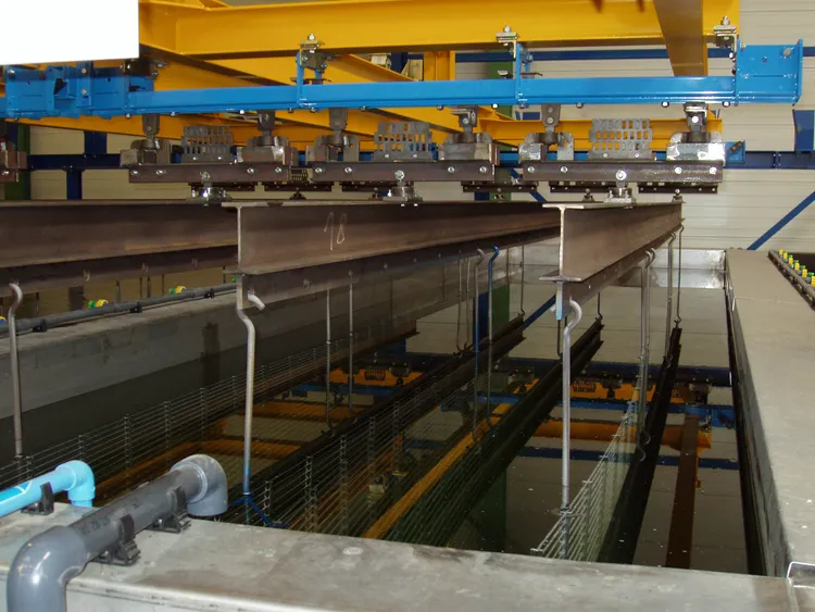 Emotech liefert, zusatzlich zu den viel verwendeten Durchlauf-Vorbehandlungstunnel auch Tauch-Vorbehandlungsanlagen. Diese Anlage umfasst verschiedene aufeinanderfolgende Becken die mit Prozessflüssigkeiten gefüllt sind. Die Produkte werden in den meisten Fällen durch einem Laufkran in die Reinigungsflüssigkeit eingetaucht. Nach Ablauf der Verarbeitungszeit wird das Produkt aus der Flüssigkeit gehoben, wonach die Produkte noch eine bestimmte Zeit über dem Becken auslaufen. Für die Förderung werden Warenträger oder Transferbrücken verwendet. Auf diese Art werden die Produkte durch die diversen Schritte gefördert, wobei der Laufkran meistens von einem Operator oder auch automatisch durch eine PLC Steuerung bedient wird.