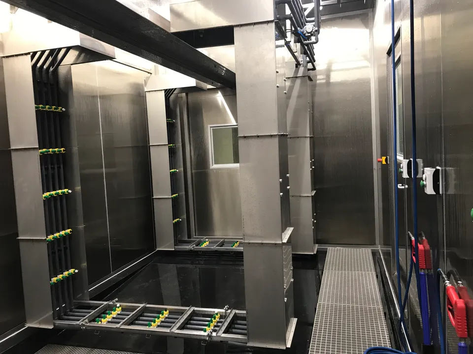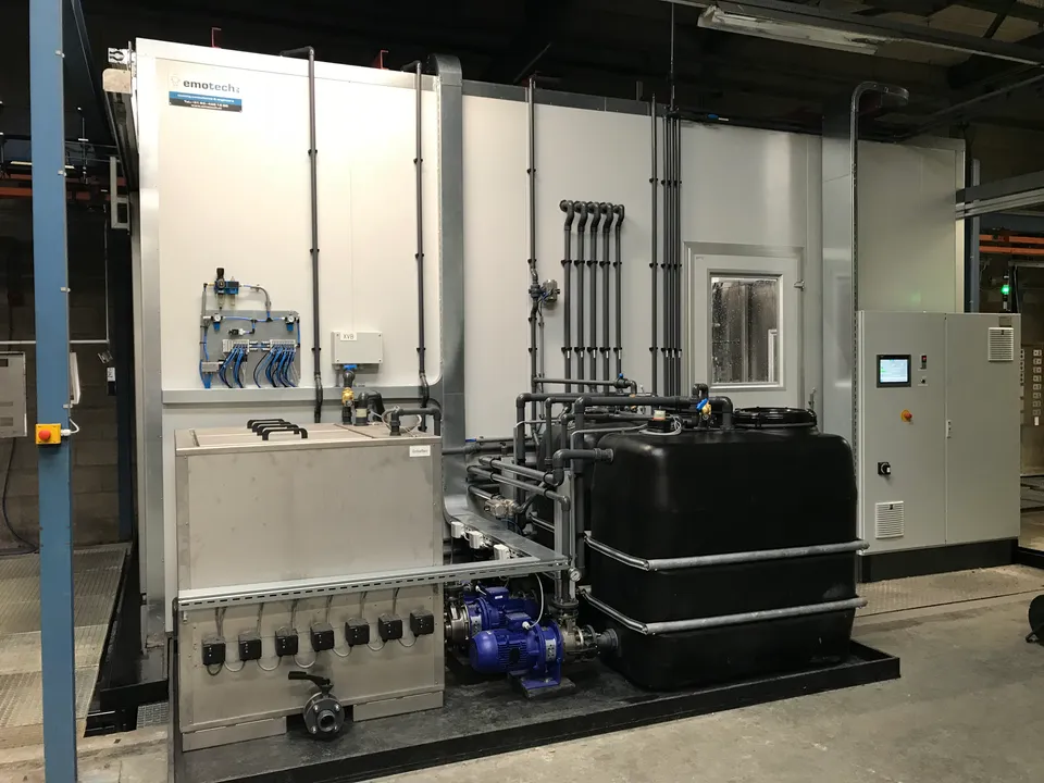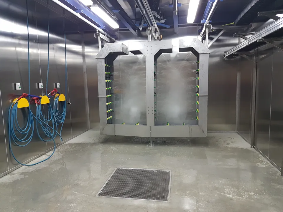 Bij de automatisch werkende reinigingscabine loopt een aangedreven sproei-inrichting met daarin meerdere sproeikransen heen en weer langs het te reinigen product. De sproeikransen worden gevoed door sterke flexibele vloeistofslangen welke in een kabelrups meelopen. Restwater wordt per gekozen reinigingsproces opgevangen in een put in de vloer en wordt teruggevoerd middels een leidingsysteem naar de corresponderende vloeistoftank, zodat de vloeistof kan worden hergebruikt.