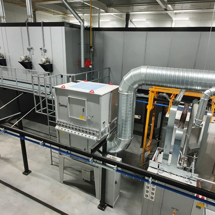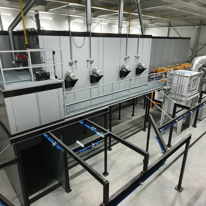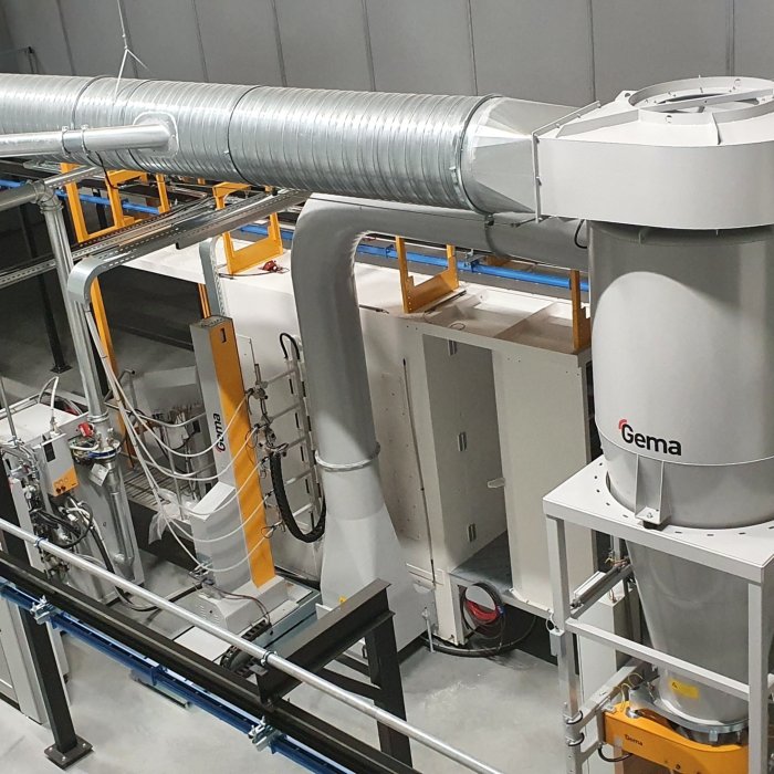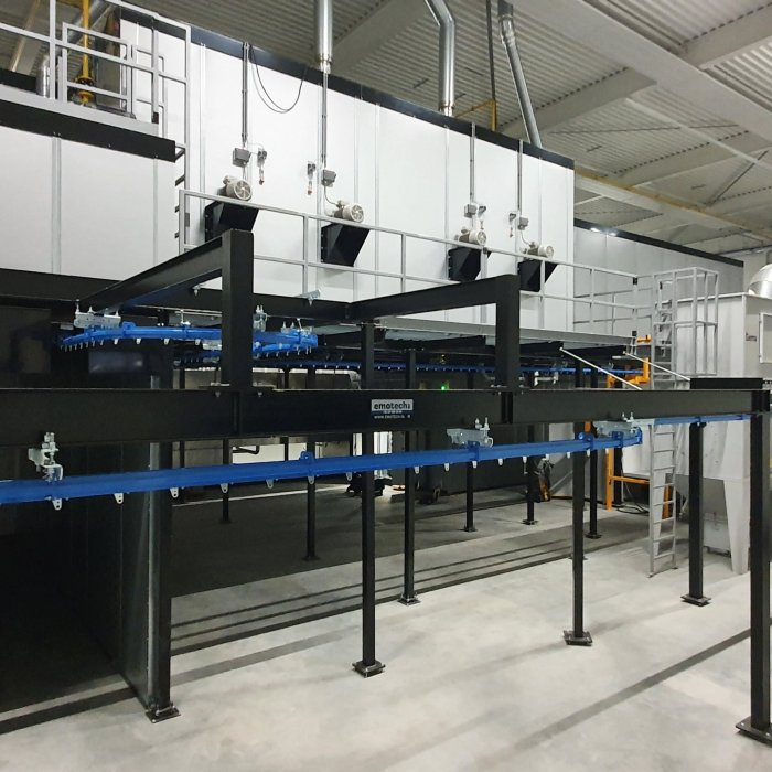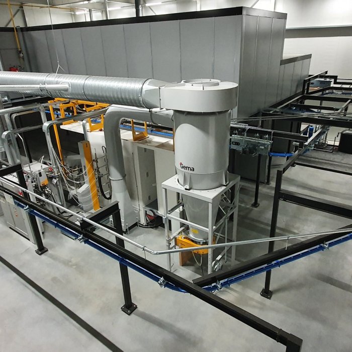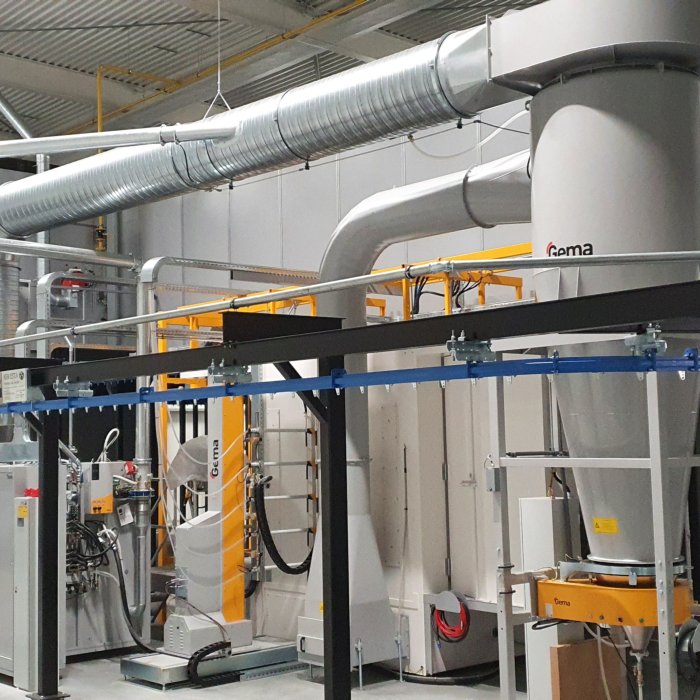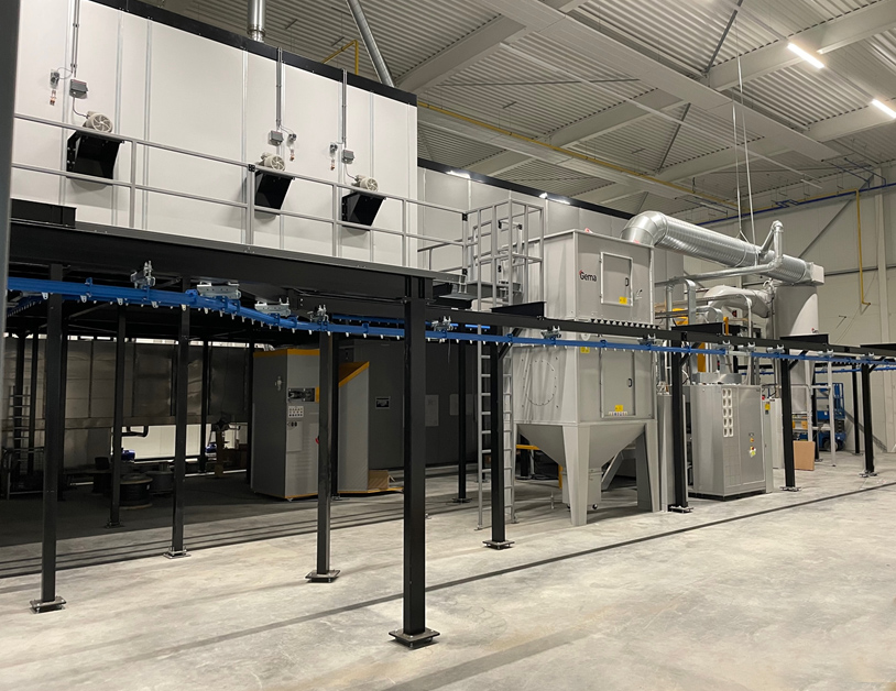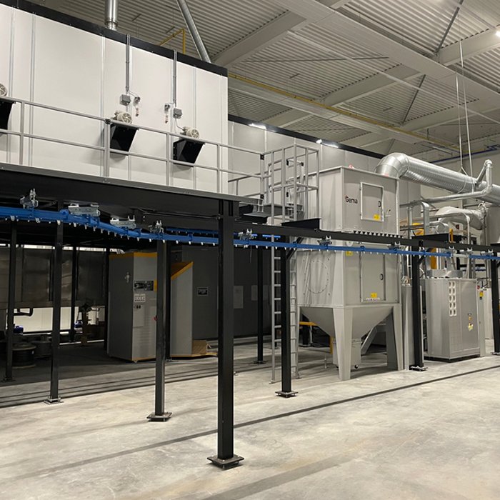 De poedercoatinstallatie bestaat uit een 3-zone RVS voorbehandeling tunnel, een A-kap droger en A-kap oven en een Gema snel kleurwissel cabine. Alle installatiedelen worden gekoppeld door een Kewesta 55Nn transportsysteem.