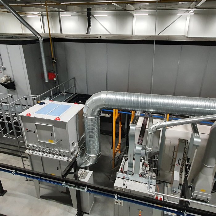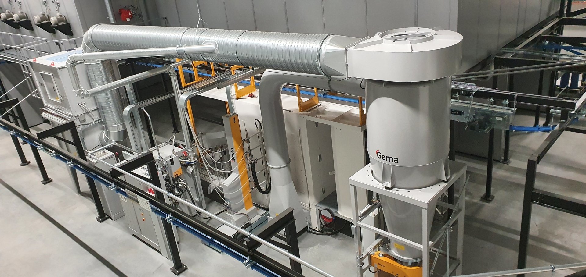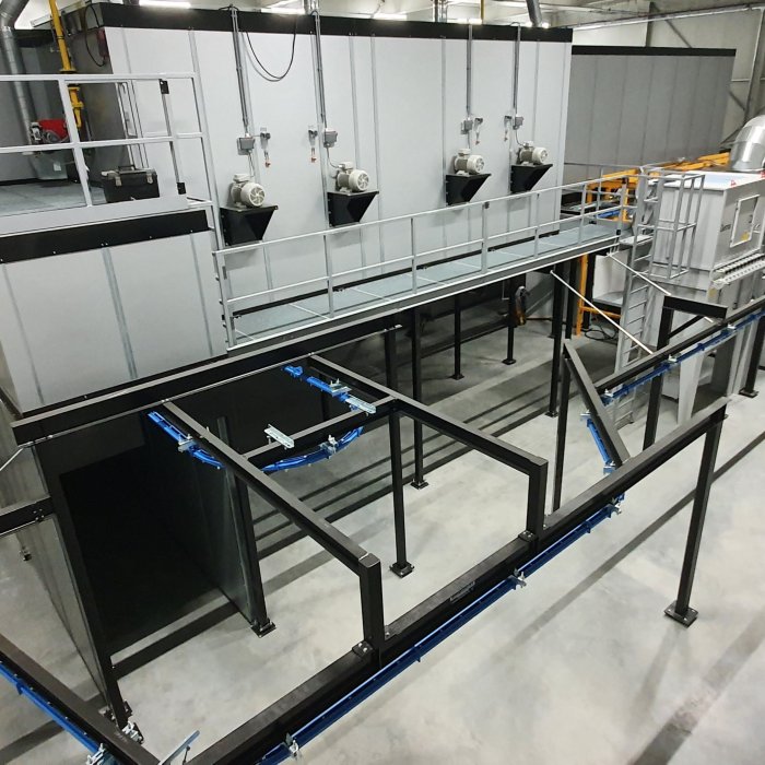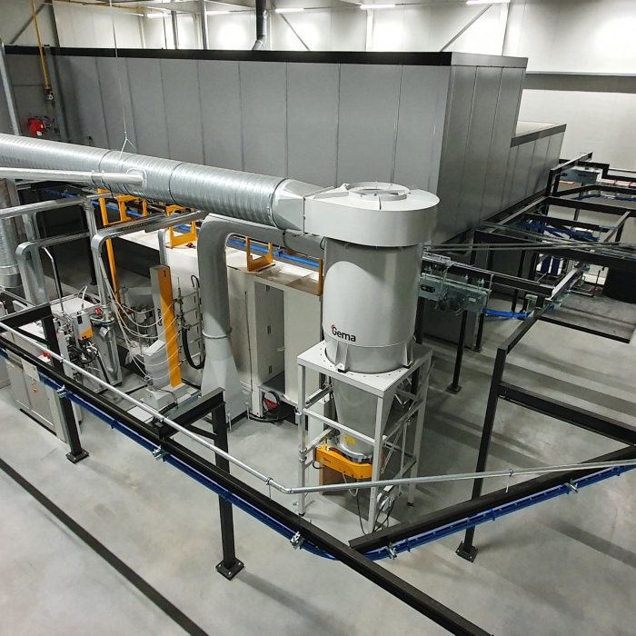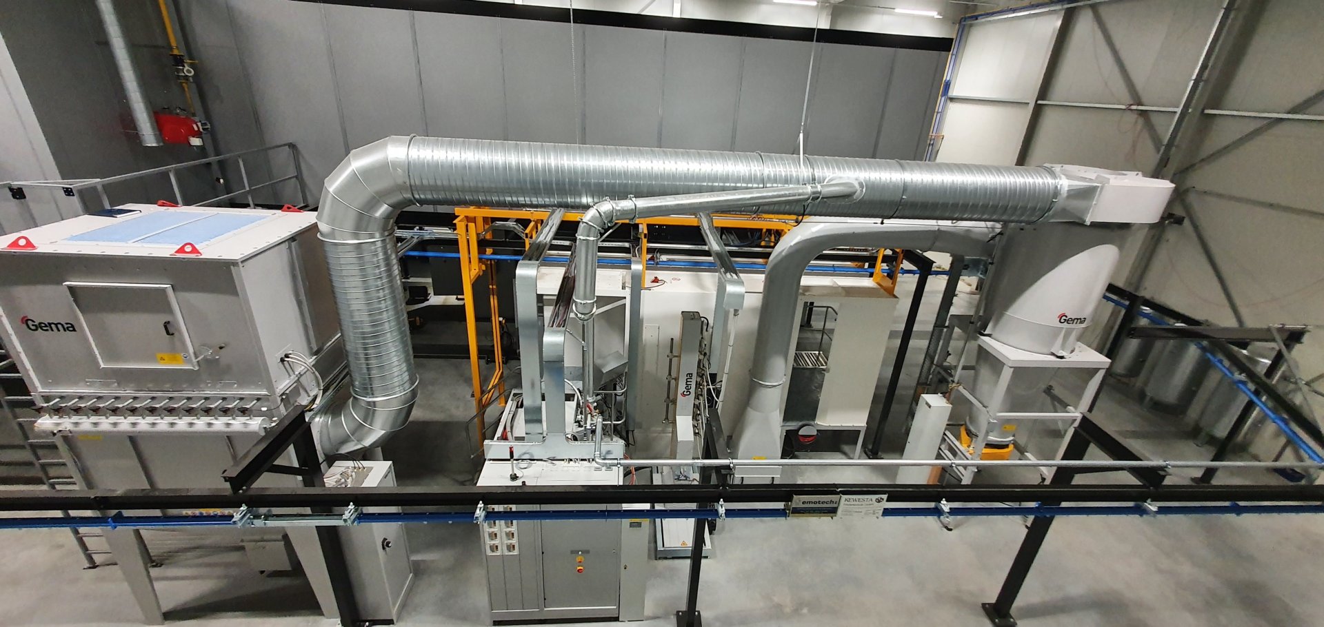 De poedercoatinstallatie bestaat uit een 3-zone RVS voorbehandeling tunnel, een A-kap droger en A-kap oven en een Gema snel kleurwissel cabine. Alle installatiedelen worden gekoppeld door een Kewesta 55Nn transportsysteem.