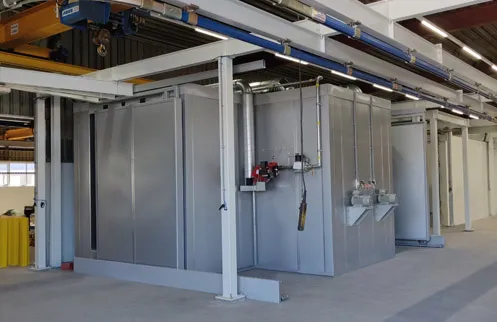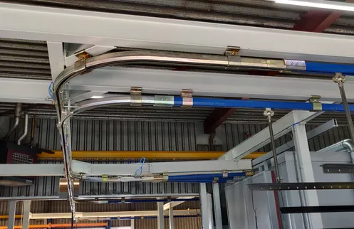 Emotech heeft binnen de beschikbare ruimte in de fabriekshal een coatinginstallatie ontworpen, geschikt om producten te coaten en te transporteren met lengtes tot maximaal 6 meter, waarbij een hoge mate van flexibiliteit mogelijk is gemaakt met toepassing van diverse pneumatisch bediende wissels. De installatie is zodanig opgebouwd dat een minimum aan inbouwhoogte is gecreëerd, zodat de bestaande drie kraanbaansystemen in de hal in werking kunnen blijven.