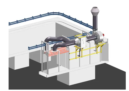 Bij onze klant Power Packer Europe Oldenzaal, waar sinds 2002 een door Emotech gebouwde Power & Free coatinginstallatie staat, bouwen we in januari 2026 een nieuwe dampafzuiging voor hun voorbehandelingstunnel. De bestaande dampafzuiging, gebouwd uit roestvrij staal, werkt nog volgens het eenvoudige principe dat een ventilator waterdamp uit de voorbehandelingstunnel aanzuigt en via een kanaal naar buiten voert. Hiermee wordt voorkomen dat ontvettingsdamp uit de voorbehandelingstunnel treedt in de fabriekshal.